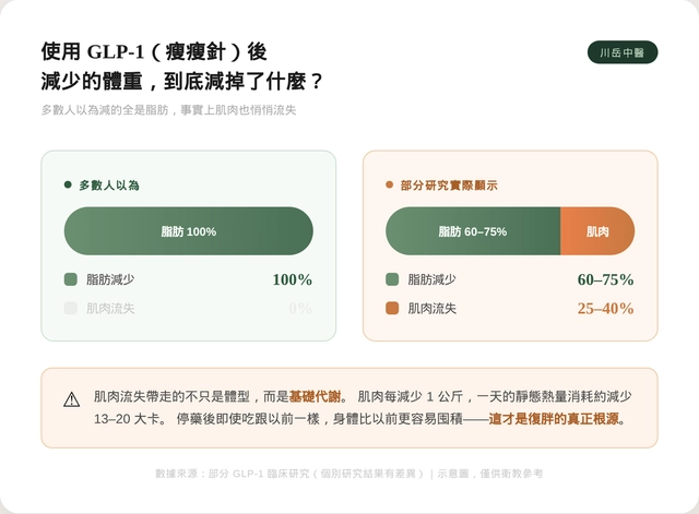 部分研究顯示,GLP-1 藥物帶來的體重減少中,有25%到40%來自肌肉組織,不是脂肪。